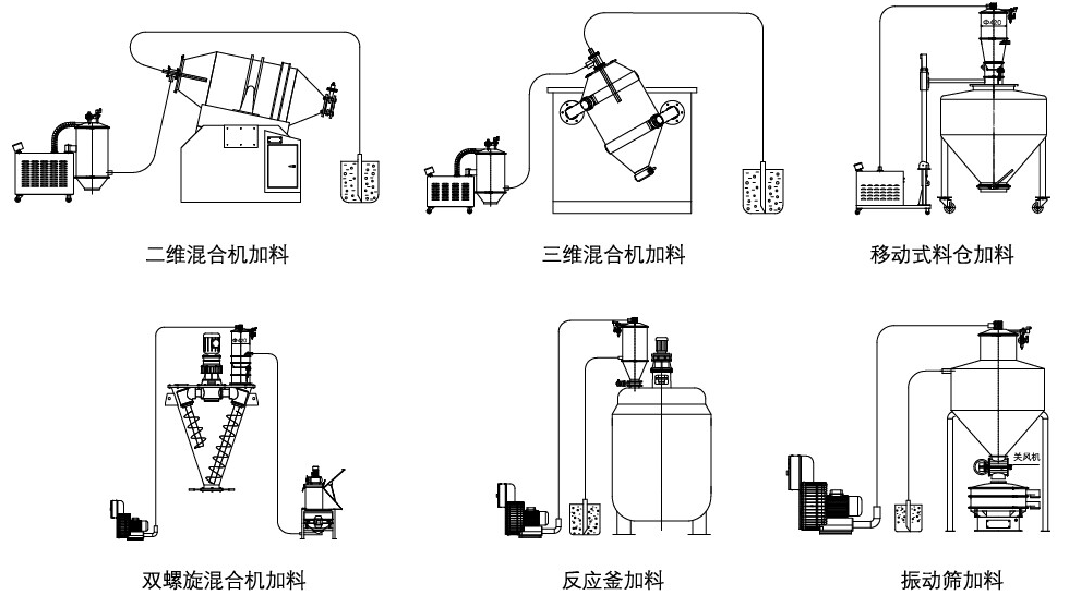三:氣動真空上料機與反應釜、注塑機、擠出機、球磨機、包裝機、粉碎機、混合機、儲料倉等設備配套。